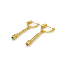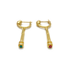 The 18K yellow gold baton hangs down from the ear and features a small stone on the bottom of each piece. One earring is adorned with a Ruby and the other with an Emerald.