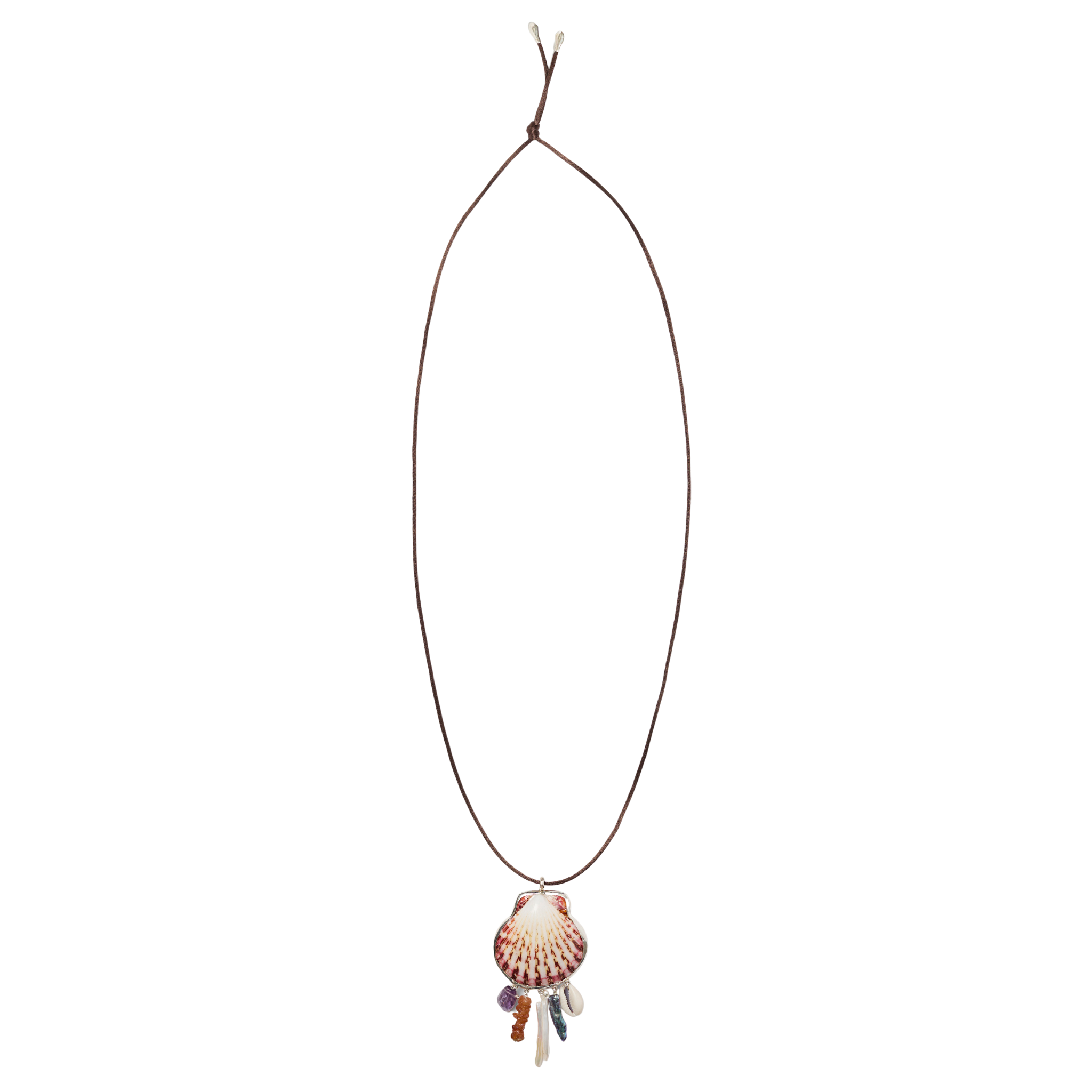 - Sterling silver necklace featuring bezel wrapped natural shell, amethyst, carnelian, and freshwater biwa pearls